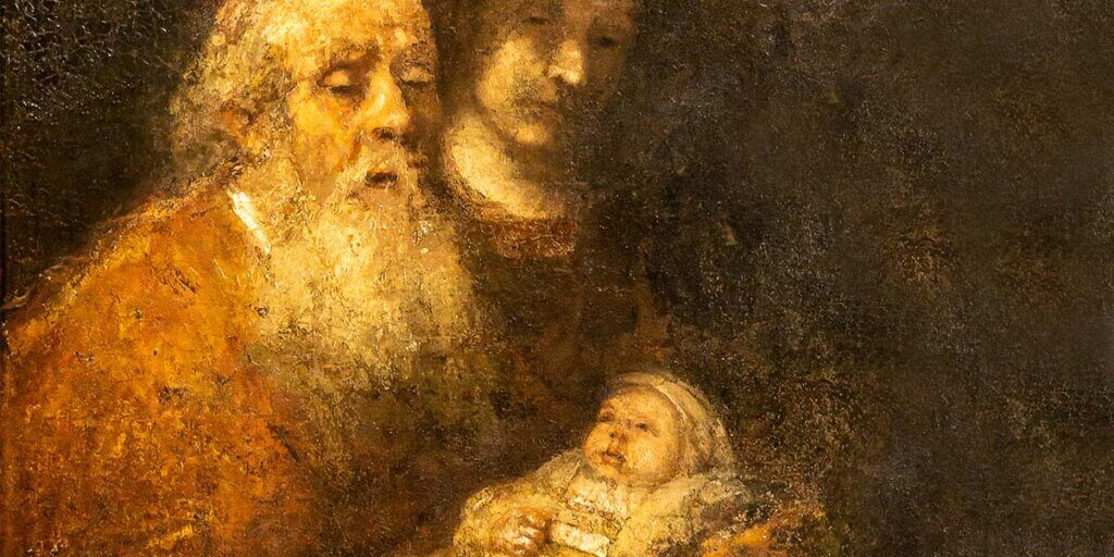 Rembrandt említett festménye meghitt, szép és megható jelenetet ábrázol, ám ugyanakkor drámai is! A templombelső félhomályban látszik, ahogy mindenki más is, az agg Simeon, Mária, József félkörben és más alakok is. Az idős ember a karjában tartja a nagyjából másfél hónapos Jézust és a teljes félhomályban egyedül a kisbaba teste, lénye ragyog, szinte világít, róla esik a fény minden és mindenki másra. Mert Simeon a világ Megváltóját, a testté lett Istent tartja a kezében! Azt, aki által minden lett, akire nézve minden él, aki által megvilágosodik és értelmet nyer minden és mindenki.