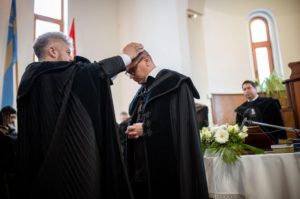 Nem, volt, hogy elbizonytalanodtam, mert világi egyetemre kezdtem vágyódni. Azt terveztem, hogy megélem az amerikai filmekben látott bulis egyetemista éveket „made in Hungary” verzióban. Jogra kezdtem készülni, el is mentem Grigely Csaba tanár úrhoz latin órára, de aztán elárulta, hogy a joghoz nem kell latinul tudni, így átmentem angolra. Viszont végig jártam hittanfakultációra, és hittanból is érettségiztem 2008-ban. Továbbá édesanyámnak voltak bölcs kérdései, amikre válaszolva kijózanodtam. Két kérdést tett fel: mi kell ahhoz, hogy az egyetemen jól érezd magad; mi kell ahhoz, hogy végig bulizd az öt évet? Mindkettőre azt feleltem, hogy pénz. Mire ő mindkét válaszomra világosan megmondta, az nekünk nincs. (elmosolyogja magát) Ezen kvalitáshiány nyomán elindultam a teológiára, ahol nekem kellett öt év, mire tényleg elhatározássá vált az, hogy egész életemben ezt szeretném csinálni. Egyébként az is egyértemű jele volt Istennek, hogy sem Sopronba, sem Győrbe nem vettek fel gazdálkodás és menedzsment szakra, ahova csak a barátaim miatt mentem volna, és a mai napig nem tudom, mit tanultam volna ott. Szóval végül a pápai Március 15. tér egyik oldaláról átköltöztem a másik oldalára, és így lettem teológus. (nevet) Amikor beköltöztem a teológiára, megtudtam, hogy tizenkilenc évesen egy matematika-fizika tanár lesz a szobatársam, ezért elsírtam magam a szobában. Aztán pár perc múlva kopogtak az ajtón, és Papp Laci jött be (Szerkesztői megjegyzés: Papp László tarjáni lelkipásztor), hogy a 222-be átmehetek, ha szeretnék, mert náluk van még egy üres ágy. Minden gyász alól felszabadulva költöztem át az utcafronti galériás szobába, ahova tíz évre oda is gyökereztem. A szomszédban lakott Xeravits Géza tanár úr, aztán később Németh Tamás rektor úr. Jó néhányszor kopogott át éjféltájban, hogy csendesebben örvendezzen és vigadjon az ifjúság. Miután Papp Laci megházasodott, egy másik szobába átköltözött, és két új szobatársam lett, Gyöngyösi Dávid és Farkas Balázs. Balázzsal a mai napig tart a barátságunk, amit a 222-es szobának köszönhetünk. (Szerkesztői megjegyzés: Farkas Balázs tatai lelkipásztor.)